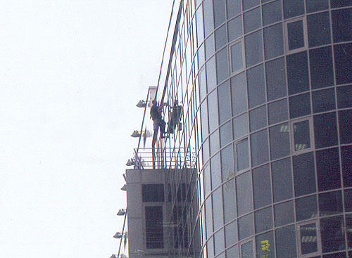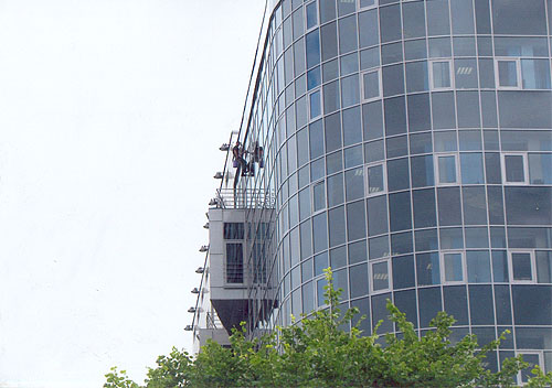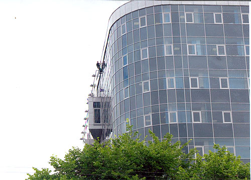 Спецификой работы над фасадом офисного здания в Теплом Стане стало то, что работы проводились как доделка и частичная переделка уже якобы выполненных работ. Предыдущая бригада промышленных альпинистов провела мытье окон и фасада только по основным плоскостям, оставив нетронутыми козырьки и пространство вокруг них, подбалконные плоскости, а также ряд других труднодоступных мест. Наружная поверхность офисного здания представляет собой практически сплошную поверхность из стекла с каркасом металлических рам-держателей. Для таких фасадов важна чистота внешней поверхности как с эстетической точки зрения, так и с точки зрения практичной экономии электроэнергии за счет использования естественного освещения. Частичное загрязнение фасада выглядит даже более неприятно, чем просто грязное здание, так как контраст между помытой блестящей стеклянной поверхностью и грязными мутными участками становится более очевиден. Между тем фактор общего восприятия внешнего вида здания сказывается как на имидже компании, так и на мотивации сотрудников компании. Для клиентов и заказчиков грязный офис - это указание на отсутствие средств и некоторую нечистоплотность (причем и в прямом, и в переносном смысле). Для производительности работников компании имеет значение, в каких условиях они трудятся - в затемных офисах, куда сквозь пыль едва пробивается свет с улицы, или в жизнерадостных пространствах, откуда открывается вид на окружающий город. Команда промальпинистов за три дня устранила всю грязь с фасада и окон здания, включая все зоны с затрудненным доступом. Работы велись методами промышленного альпинизма со всеми необходимыми мерами безопасности. Фасады и окна были вымыты, козырьки, балконы, главный вход очищены от всех слоев загрязнений и составили единое целое с чистым, сверкающим отражениями зданием. Промальп для высотки на Сиреневом бульваре