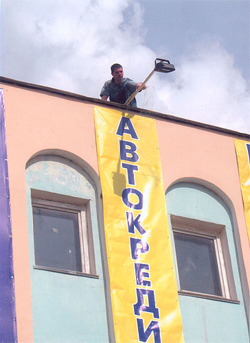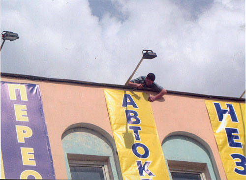 На офисном здании было размещено несколько нат¤жных баннеров с информацией об услугах, предоставл¤емых автосервисом.